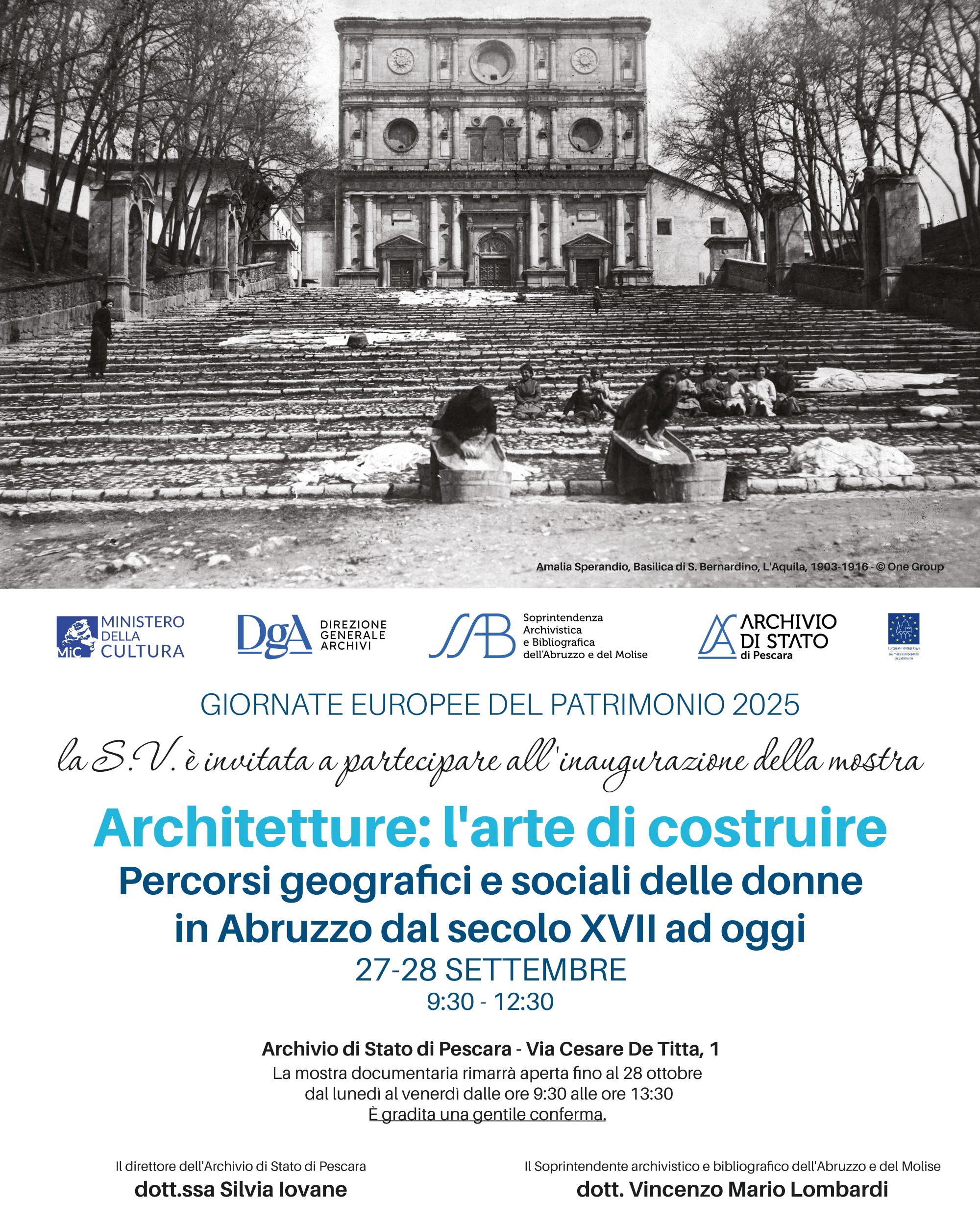 PESCARA - In occasione delle Giornate Europee del Patrimonio 2025 (European Heritage Days), promosse dal Consiglio d’Europa e dalla Commissione Europea, con il patrocinio del Ministero della Cultura, la Soprintendenza Archivistica e Bibliografica dell’Abruzzo e del Molise e l’Archivio di Stato di Pescara presentano Architetture: l’arte del costruire. Percorsi geografici e sociali delle donne in Abruzzo dal secolo XVII ad oggi, una mostra documentaria dedicata alle costruzioni sociali e i luoghi vissuti dalle donne attraverso i secoli.