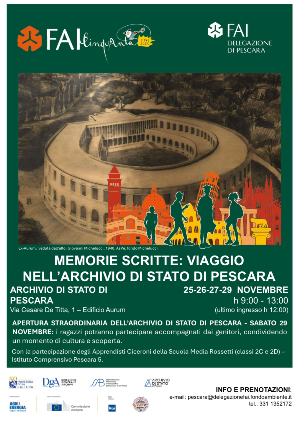 Per l’occasione, anche l’Archivio di Stato di Pescara ospiterà gli studenti che saranno accolti dagli Apprendisti Ciceroni, giovani volontari appositamente formati dai docenti e dai volontari del FAI. Con il contributo del personale dell’Archivio i ragazzi guideranno i loro coetanei alla scoperta di documenti, ambienti e testimonianze storiche custodite all’interno dell’Istituto.